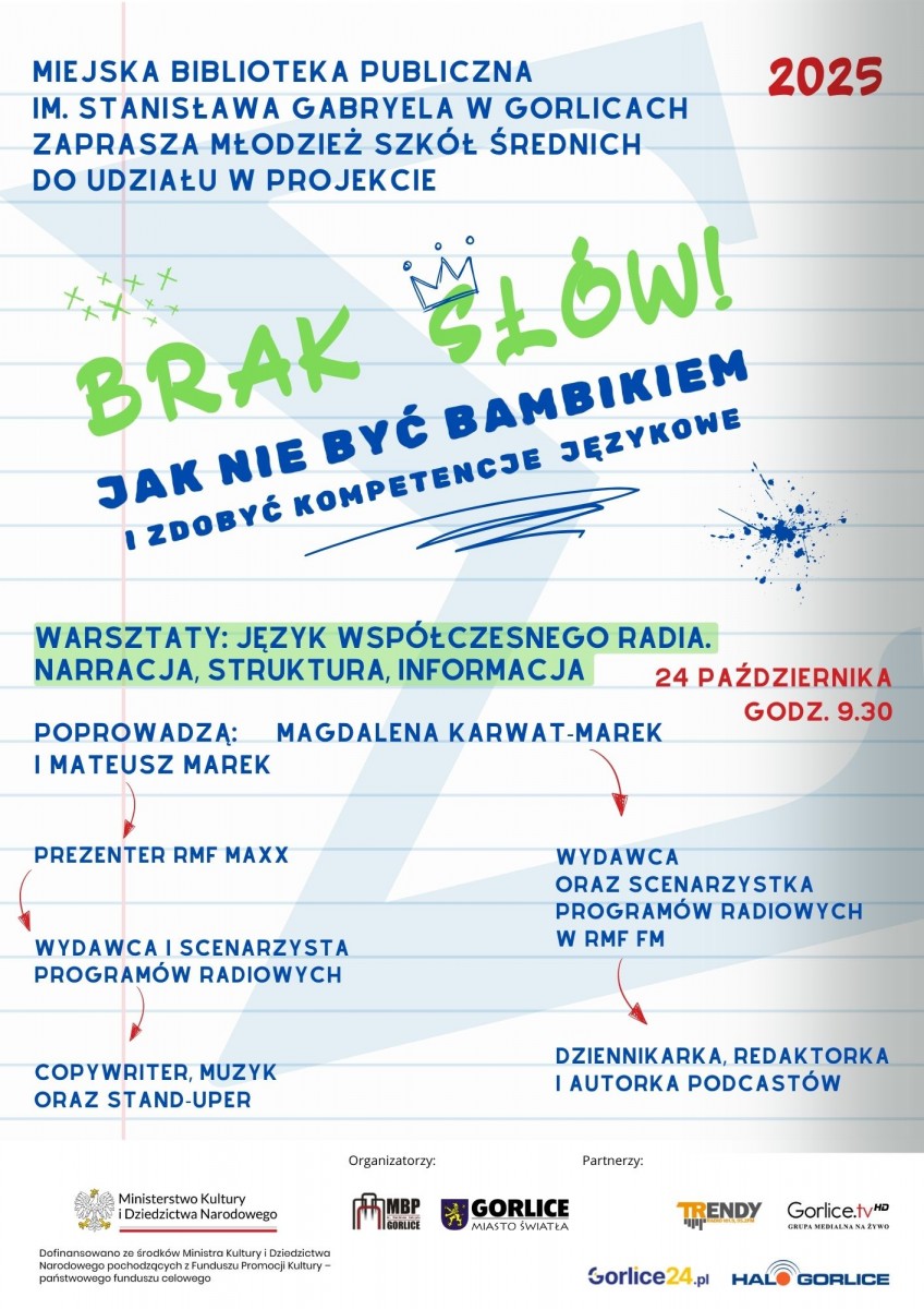 Miejska Biblioteka Publiczna im. Stanisława Gabryela w Gorlicach organizuje warsztaty pt. „Język współczesnego radia. Narracja, struktura, informacja”, które odbędą się 24 października 2025 (piątek), o godz. 9.30. Zajęcia poprowadzą: Magdalena Karwat-Marek i Mateusz Marek.