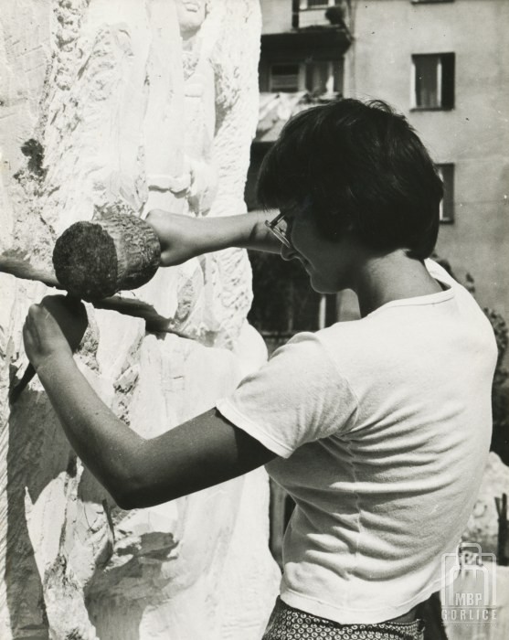Ewa Krauze podczas pracy w „pracowni” przed blokiem