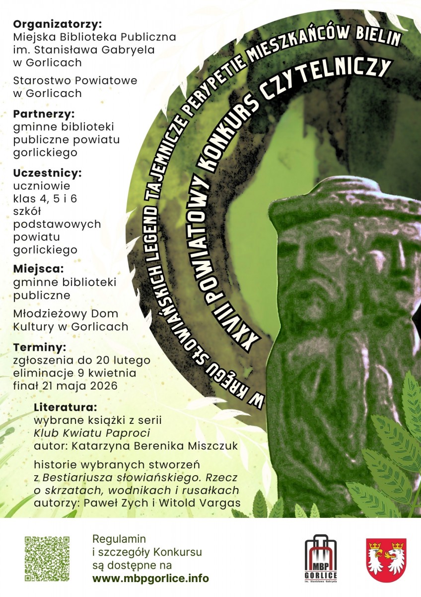 Miejska Biblioteka Publiczna w Gorlicach zaprasza uczniów klas 4, 5 i 6 szkół podstawowych powiatu gorlickiego do udziału w tegorocznej edycji Powiatowego Konkursu Czytelniczego, który w tym roku odbywa się pn. „W kręgu słowiańskich legend — tajemnicze perypetie mieszkańców Bielin”.