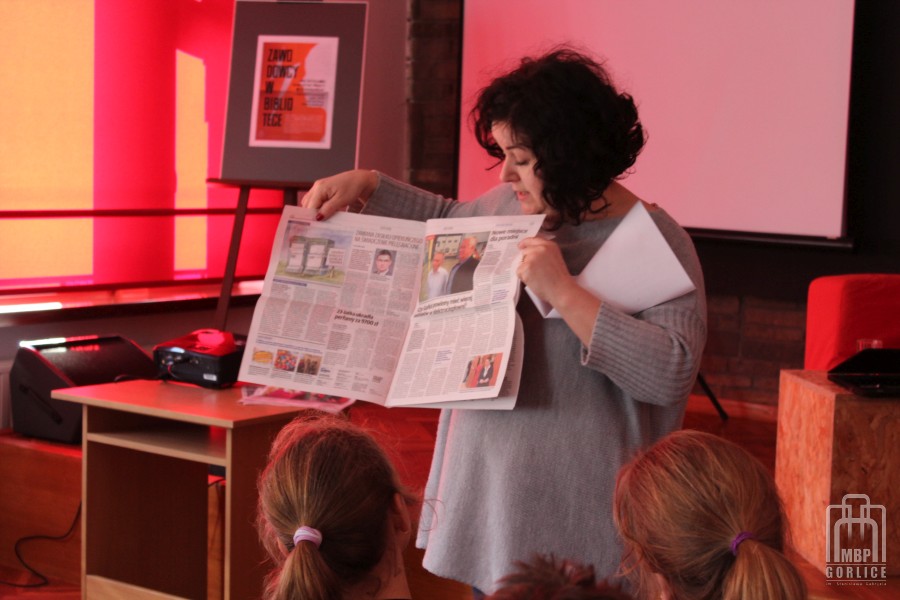 Agnieszka Nigbor-Chmura — dziennikarka, kierownik redakcji Gazety Krakowskiej w Gorlicach była gościem naszej biblioteki. Na spotkaniu zorganizowanym w ramach cyklu Zawodowcy w bibliotece opowiedziała uczniom klas piątych z Miejskiego Zespołu Szkół nr 6 w Gorlicach jak na co dzień wygląda jej praca w redakcji lokalnej gazety. Gazeta Gorlicka to tygodnik, który wydawany jest w każdy wtorek i piątek. Jego publikacja możliwa jest dzięki pracy kilku dziennikarzy specjalizujących się w konkretnej tematyce. Pani Agnieszka zapoznała zebranych z podstawowymi pojęciami związanymi z organizacją pracy dziennikarza oraz strukturą informacji prasowej. Każdy artykuł, konstruowany według zasady od szczegółu do ogółu, powinien odpowiadać na pięć podstawowych pytań: Kto? Co? Kiedy? Gdzie? Dlaczego? Praca dziennikarza polega na ciągłym zdobywaniu informacji, a te można znaleźć dosłownie wszędzie, „na ulicy”, w pobliskim sklepie, w instytucjach. W tym zawodzie o każdej porze trzeba mieć „oczy szeroko otwarte” i „dookoła głowy”. Podstawową misją gazety jest informowanie społeczeństwa o tym, co ważnego dzieje się w regionie, w kraju, na świecie. Misją lokalnych mediów jest także wspieranie najbardziej potrzebujących. Gazeta Gorlicka często inicjuje i angażuje się w różnego rodzaju akcje charytatywne.