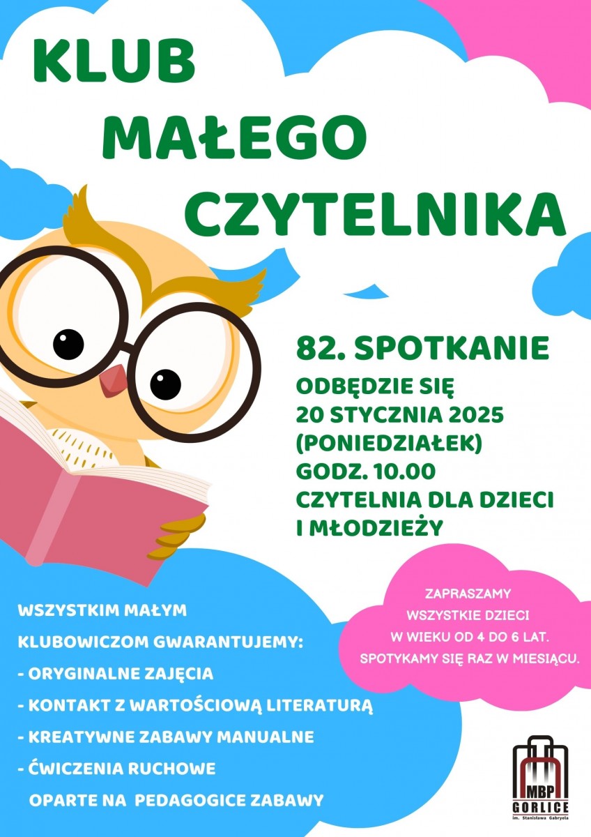 Serdecznie zapraszamy na kolejne spotkanie Klubu Małego Czytelnika, które odbędzie się 20 stycznia 2025 roku (poniedziałek) o godz.10.00 w Czytelni dla Dzieci i Młodzieży (ul. Jagiełły 1). Do zobaczenia!