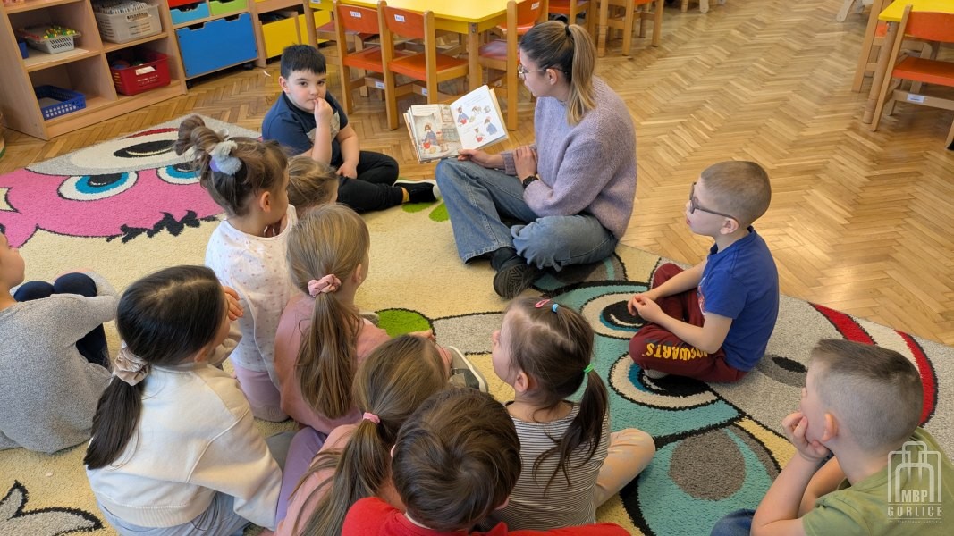W środę, 5 lutego bibliotekarki ponownie odwiedziły grupę przedszkolaków z Miejskiego Przedszkola Nr 1 w Gorlicach. Spotkanie rozpoczęło się od głośnego czytania książki Myszonek pomaga w domu, autorstwa Riikki Jäntti. Dzieci z zaciekawieniem słuchały opowieści o małej myszce, która dopiero co uczy się pomagać w codziennych obowiązkach domowych. Książka w prosty i zabawny sposób przekazała przedszkolakom, jak ważna jest współpraca w rodzinie oraz że każdy z domowników – nawet najmłodszy – może przyczynić się do utrzymania porządku w domowej przestrzeni. Po zakończeniu lektury, dzieci miały okazję podzielić się swoimi doświadczeniami związanymi z pomocą w domu. Niektóre opowiedziały jak pomagają w sprzątaniu, nakrywaniu do stołu czy podlewaniu roślin, a inne z radością opisały swoje ulubione zajęcia domowe. Następnie przedszkolaki zostały zaproszone do obejrzenia książki Odkrywaj świat z magiczną latarką. Publikacja jest przepełniona ilustracjami, które zachęciły dzieci do aktywnego uczestnictwa w zabawie. Jej każda strona została wzbogacona o elementy, które dzieci mogły „odkrywać” za pomocą dołączonej latarki. Dzięki temu stała się ona nie tylko zwykłą opowieścią, ale także interaktywnym doświadczeniem, które pobudzało wyobraźnię i ciekawość świata. Przedszkolaki miały okazję przyjrzeć się detalom ilustracji, a także zgadywać, co kryje się za kolejnymi, tajemniczymi obrazkami. Spotkanie zakończyło się zabawą ruchową.