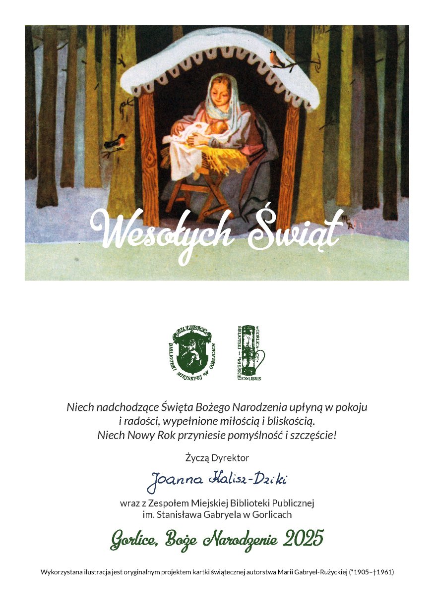 Drodzy Czytelnicy! Zespół MBP w Gorlicach życzy Wam zdrowych, spokojnych i rodzinnych Świąt Bożego Narodzenia, a w nadchodzącym Nowym Roku wszelkiego dobra, pomyślności i realizacji osobistych zamierzeń.