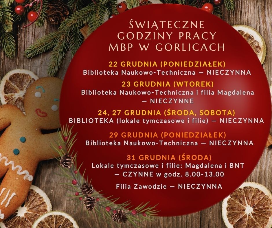 Drodzy Czytelnicy! Informujemy o świątecznych zmianach godzin otwarcia MBP w Gorlicach.