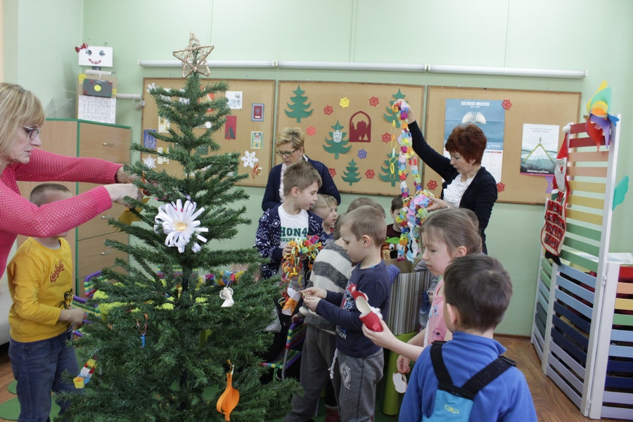 Coraz bliżej święta… a jak święta, to i choinka. Świąteczne opowieści były tematem kolejnego spotkania z dziećmi z Miejskiego Przedszkola nr 1. Kto wymyślił przyozdabianie choinki? Jaka jest jej historia? O tym wszystkim przedszkolaki dowiedziały się z prezentacji multimedialnej. Cudownie jest mieć ogród, a w nim prawdziwe drzewko. Niestety, nie każdy ma taką możliwość, ale każdy może przystroić swoje świąteczne drzewko wykonane choćby ze styropianu. Takie właśnie choinki pięciolatki ozdabiały gwiazdkami i miniaturowymi bombkami. Nie zapomniały także o drzewku w kąciku malucha, które zostało ślicznie ubrane ręcznie wykonanymi ozdobami i zmieniło się w piękną, kolorową choinkę świąteczną.